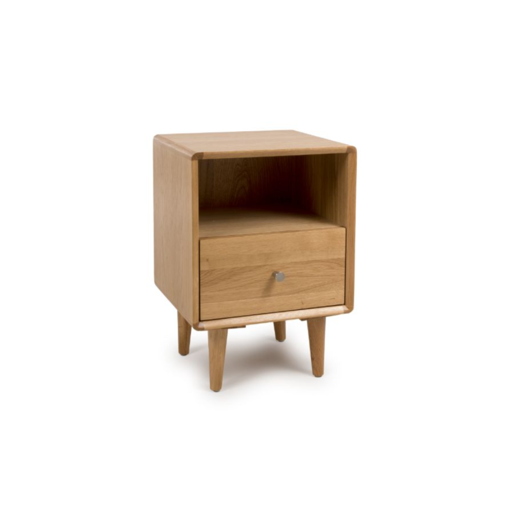 The Jenson Night Stand, with its Scandi-inspired design and retro charm, is a stylish and practical addition to any bedroom. Crafted from oak and oak veneers, this beautifully finished piece in light oak brings warmth and a minimalist elegance that complements both traditional and modern interiors effortlessly.