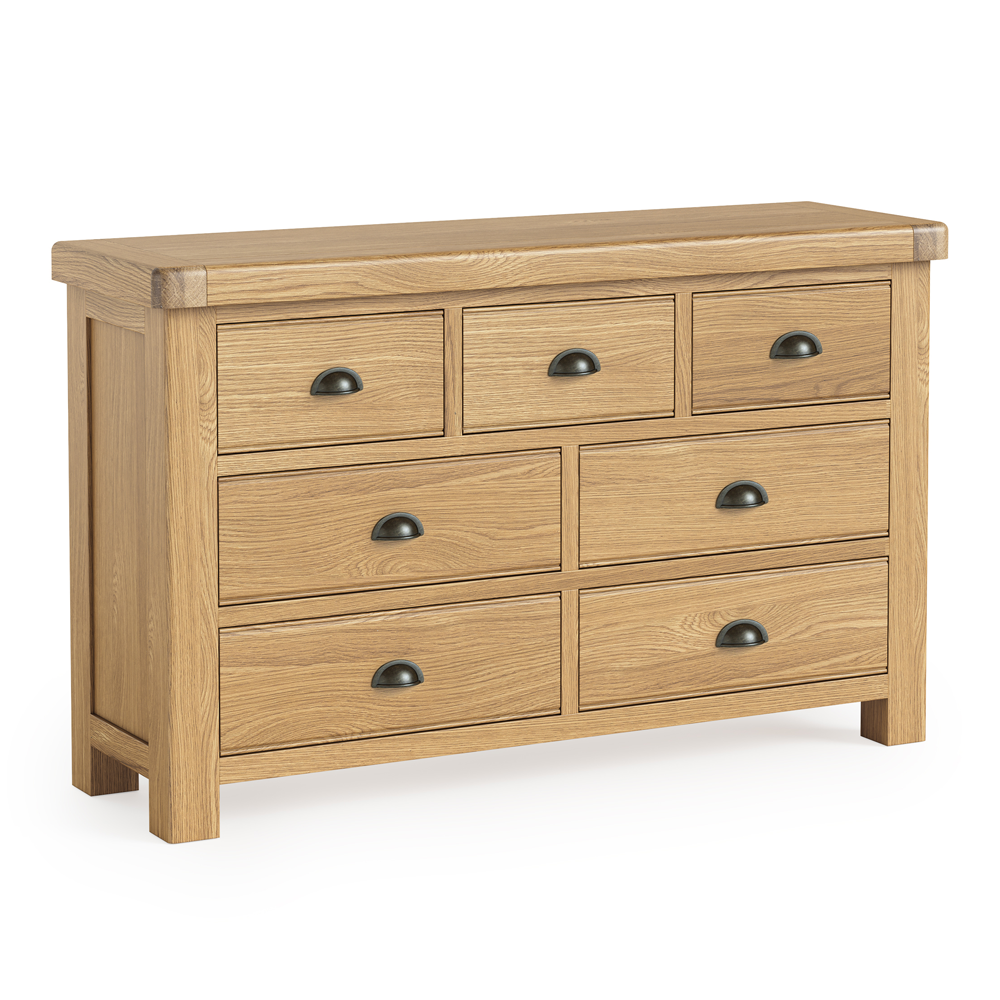 Featuring three smaller drawers across the top and four spacious full-width drawers below, the Normandy 3 Over 4 Chest provides ample storage for everything from clothing and linens to accessories and keepsakes. The smooth-gliding drawers are meticulously constructed for effortless use, while the chunky oak frame and refined detailing highlight the exquisite craftsmanship behind each piece.